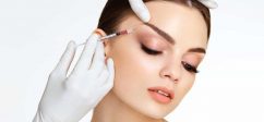 Eine Person mit geschlossenen Augen erhält von einer behandschuhten Hand eine kosmetische Injektion im Augenbrauenbereich, wobei der Schwerpunkt auf einer Gesichtsverschönerung und Hautstraffung (Straffung) liegt.